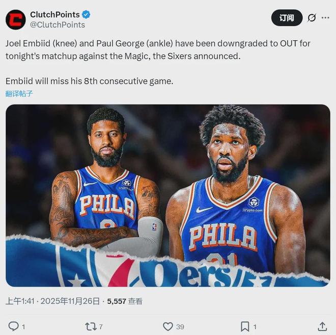 北京时间11月26日,NBA杯小组赛:76人主场vs魔术。赛前76人官方宣布:恩比德(右膝伤势)、乔治(右脚踝受伤)、埃奇库姆(小腿受伤)全部休战。这是恩比德连续缺席的第8场比赛,乔治复出打了3场,如今又歇菜了。
