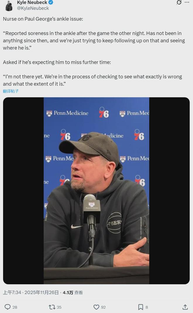 恩比德是膝伤复发,自11月9日之后再也没出战过。76人主帅纳斯透露,恩比德已经跟球队合练,目前的状态仍为每日观察,没有准确复出时间。乔治是怎么受伤的?纳斯也不知道!乔治表示自己感觉脚踝酸痛,需要检查才知道出了什么问题。