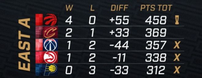 东部A组:猛龙4连胜提前晋级,步行者0胜3负提前出局。而因为后面东部C组的第2确定是3胜1负,所以奇才和老鹰就算是小组第2也会出局,因此A组悬念只剩下骑士了。