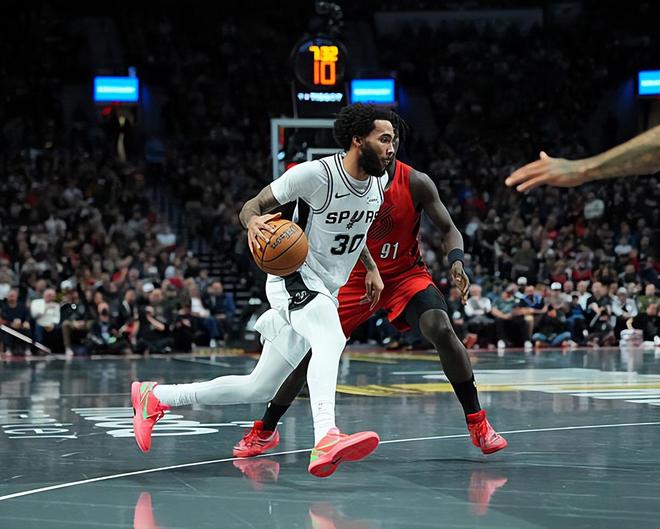 本场比赛中,马刺的先发锋线大将朱利安-尚帕尼(Julian Champagnie)的表现还是相当不错的。尚帕尼全场出场32分18秒,投篮10中5,三分线外5中2,得到了12分11篮板2助攻2盖帽的两双数据,还有1次失误和1次犯规,正负值为+10。尚帕尼在进攻端还是保持了稳定的水准,他的进攻效率相当不错,他也具备不错的投射能力,他也是能够在进攻端起到比较全面的效果。不仅如此,尚帕尼在防守端的表现也是值得肯定的,他也是发挥出了自己在防守端的功能,在篮板保护甚至是内线防守方面都起到了不错的效果。总体来看,尚帕尼在本场比赛中的表现算得上是攻守兼备,他确实是将自己在攻防两端的特点都充分发挥了出来,并且为球队的胜利做出了巨大的贡献。